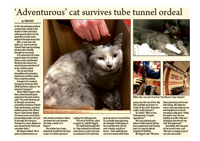 A ballad for Blitz: owner pens song for missing cat who survived Tube tracks ordeal