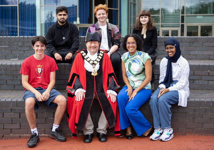 Highbury Grove students Eduardo and Aymen and, back row, Owen, Nevin and Naaema with Islington mayor Cllr Gary Heather and council leader Cllr Kaya Comer-Schwartz