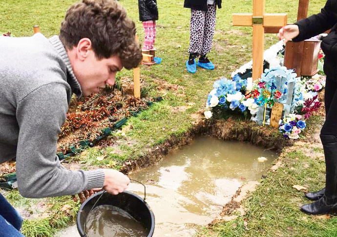 GRIEVING families had to bail out their loved ones’ graves with buckets after part of a cemetery flooded during the weekend’s downpour.