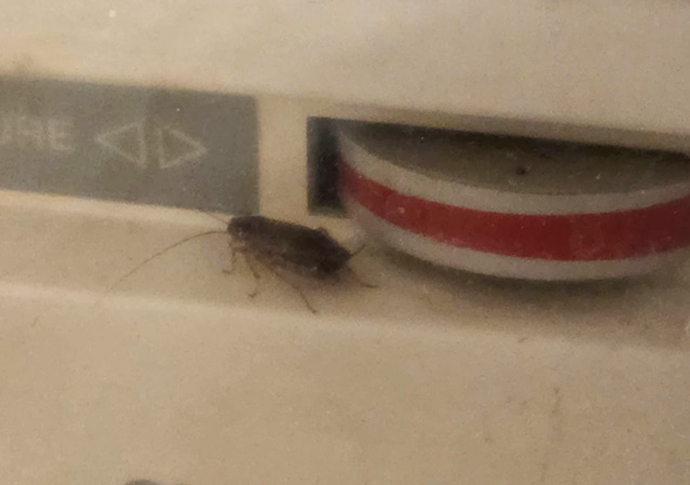 Tenant Kane Wilson’s kitchen in the building’s basement flat. Below: a cockroach in Ms Allen’s home