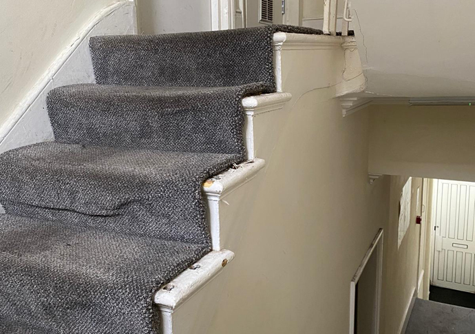 A banister in the communal hallway was ripped off in December and has not yet been fixed.
