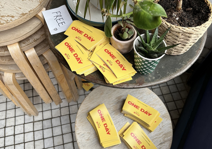 “Then Netflix sent us a whole load of merchandise for free which we were told we could give to fans on July 15. There were bags and coffee cup sleeves – the bags went very fast.”