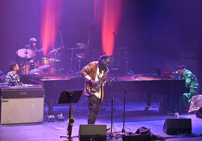 The second act consisted of pianists Bokani Dyer and Keenan Myer plus drummer Tumi Magorosi and, as special guest, our own Soweto Kinch, a quartet of seasoned pros with their own well established projects. Playing compositions by each of them, it was Soweto who soared, once he ditched the EWI (Electronic Wind Instrument – I’m not a fan) and produced muscular solos on both alto and tenor. There was also much beauty in evidence although the fact that the finale veered into a tune that threatened to echo an East End pub singalong was a surprise, but there were powerful moments from all the players.