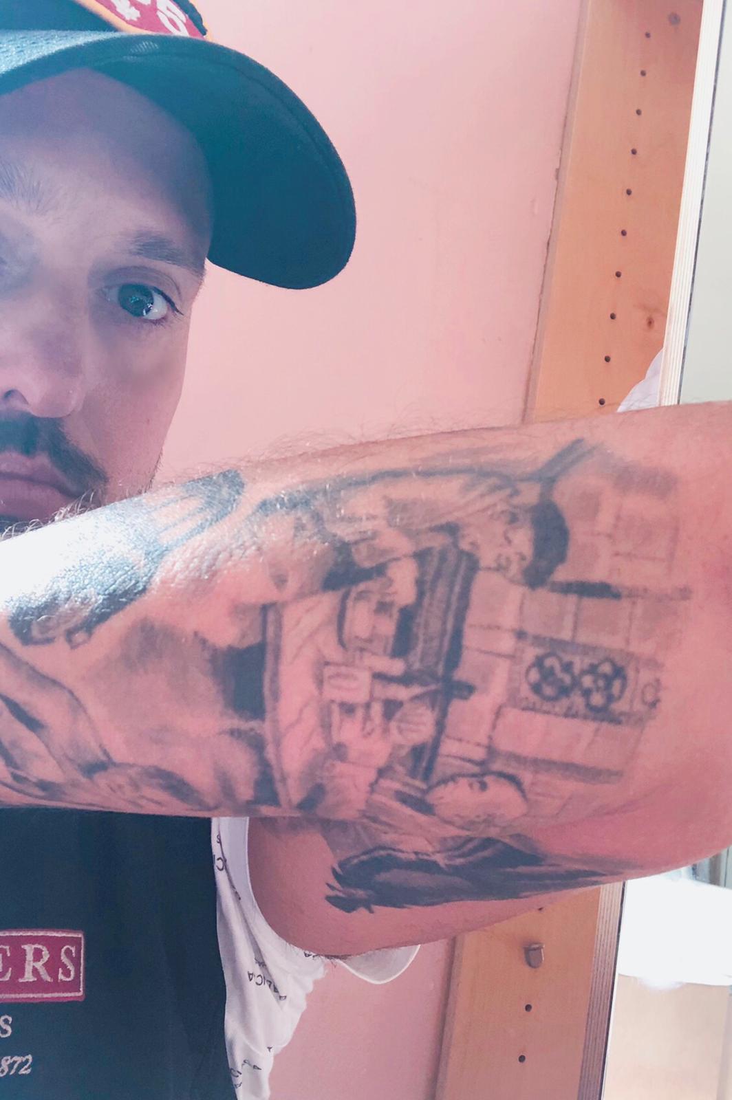 Danny Burns with the tattoo of his grandparents in the Chapel Market Manze’s