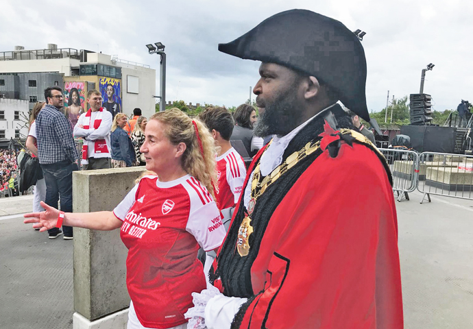 Council leader Una ‘The Gooner’ O’Halloran was in her Arsenal kit for the celebrations at the stadium on Monday.