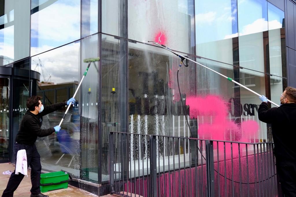 The Guardian offices have been sprayed with pink paint [SIMON LAMROCK]