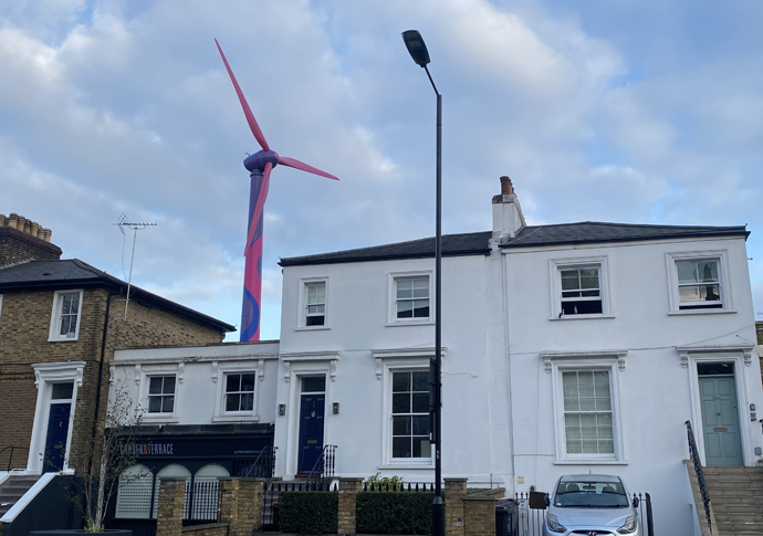 The 28-metre-high clean energy generator, affectionately known as Gusty, will only be in situ for one week, and it is part of a campaign to show how easy it is to build clean energy in urban areas – if only planning regulations didn’t get in the way.
