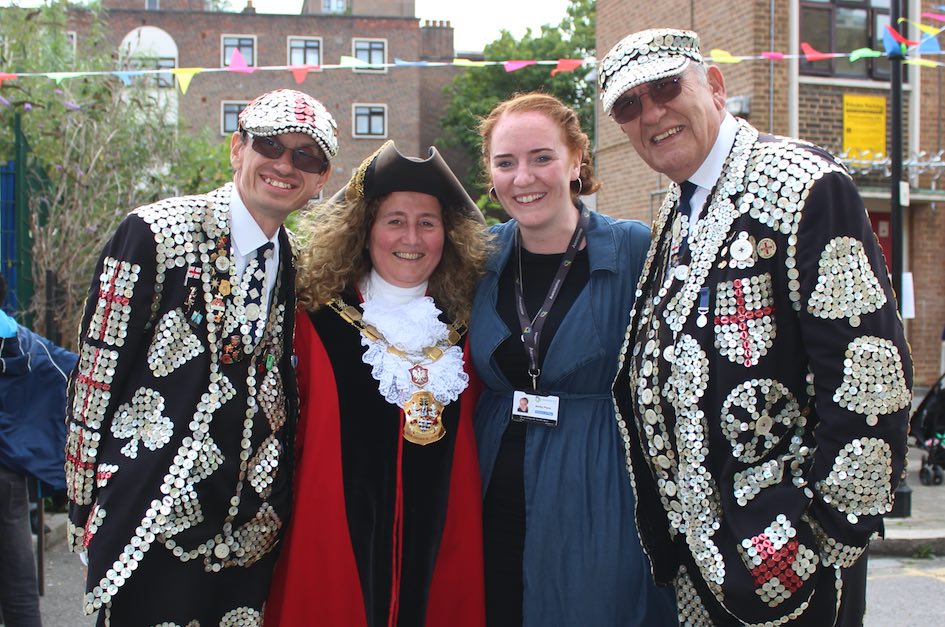 Cllr O’Halloran with the Pearly King and Prince, and party organiser Becky Pryce