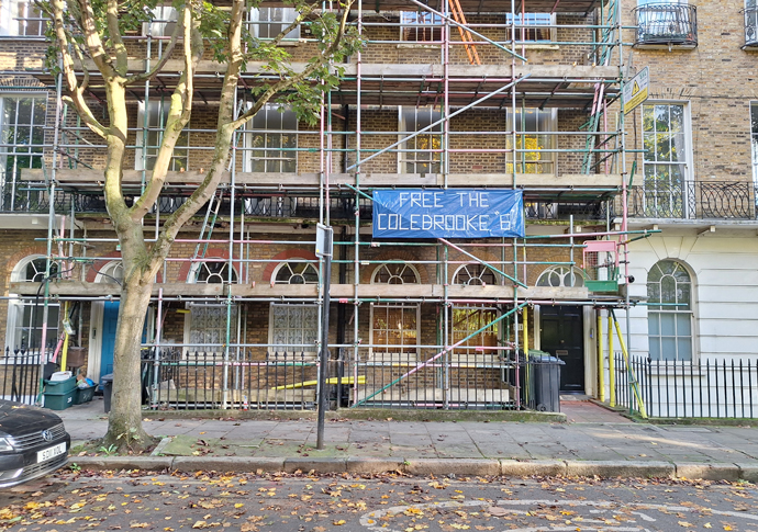 The astonishing wait with the scaffolding clamped to their homes is the reason a banner went up last year reading: ‘Free the Colebrooke Six’.