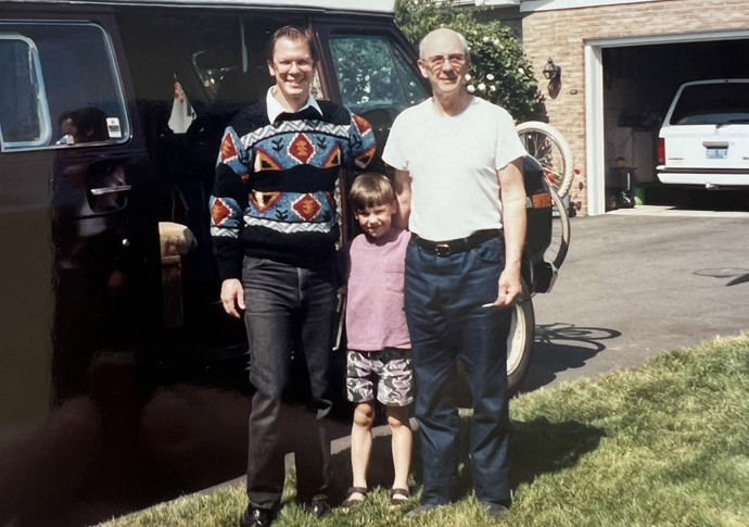 Jonathan aged five with his father Kenneth and grandfather Carl in 1991