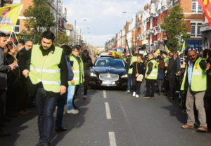 Mourners holding pictures of popular Kurdish activist Mehmet Aksoy make their way along Holloway Road ahead of Friday’s funeral service