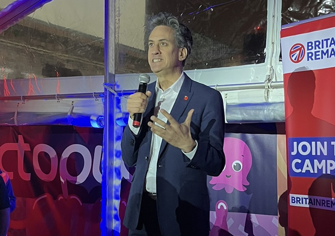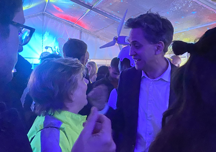 Ed Miliband speaking at a party in honour of the pink and purple wind turbine