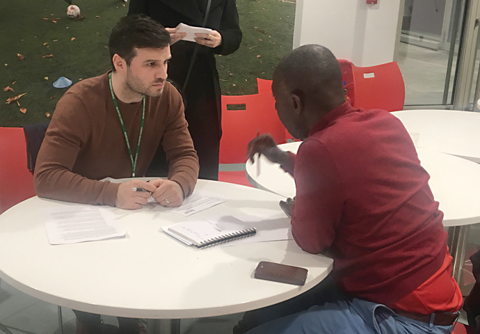 Jonathan Gallagher in discussion with a resident