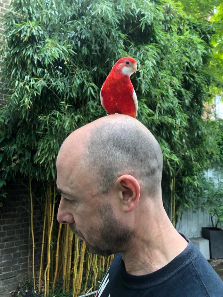 The exotic flyer took a shine to Kieran Smythe’s head after he and wife Janet saved the bird from a pack of magpies.