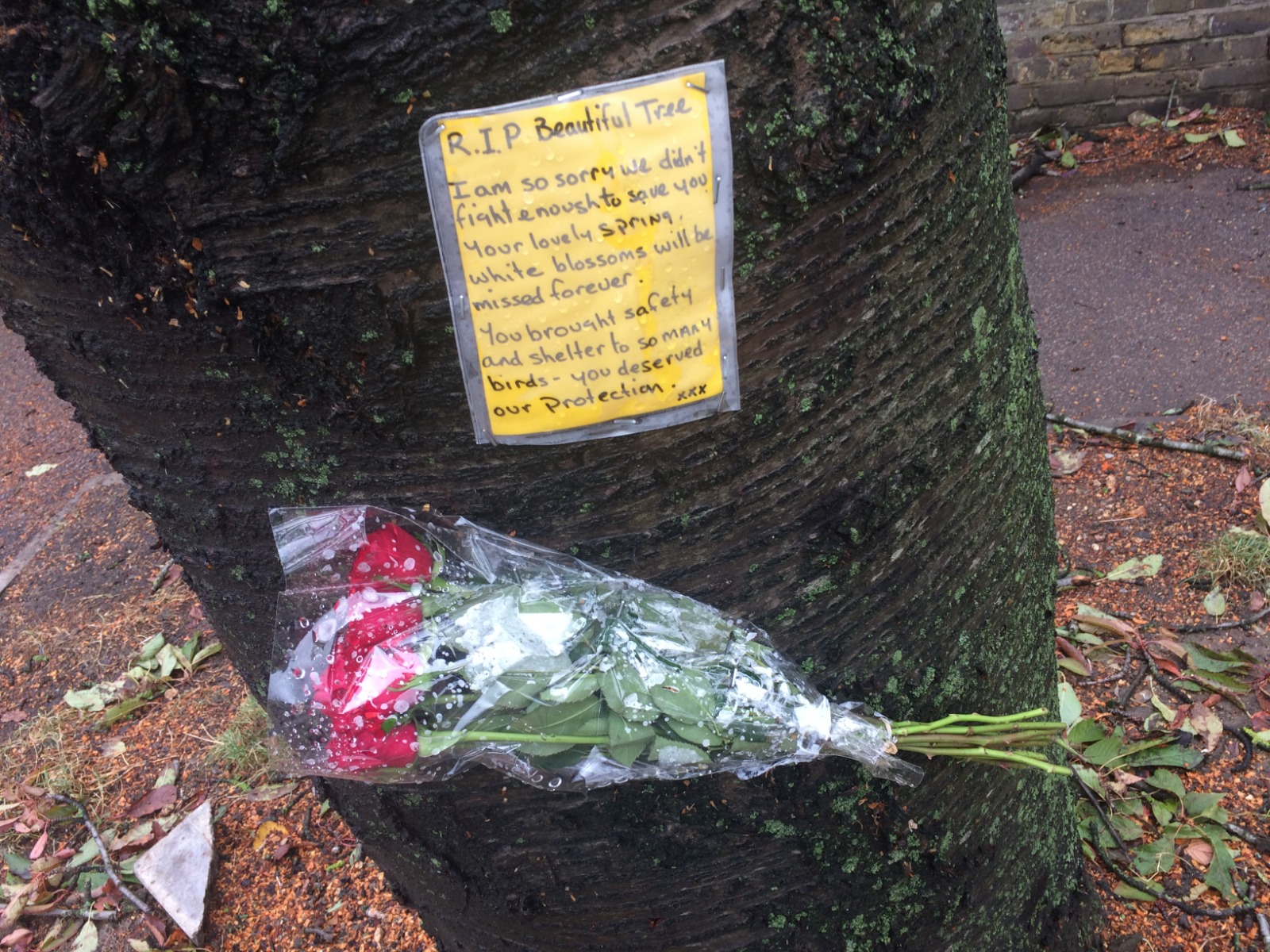 The white blossoming tree, at the junction of Gloucester Avenue and Oval Road, Camden Town, was “removed” on Network Rail orders. Its roots are damaging a railway tunnel below but dozens of residents have complained about the “vandalism of the community”.