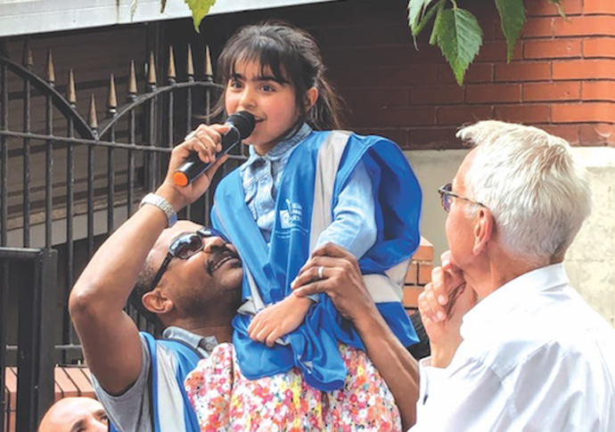 Maria, 4, tells the crowd: ‘I’m a refugee’