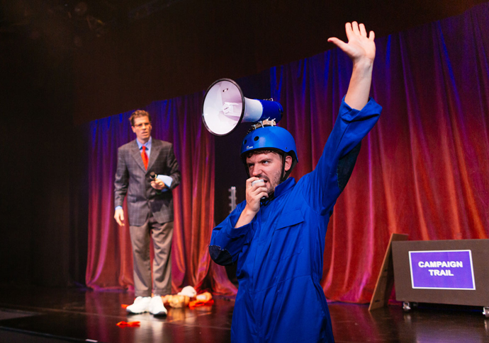 Performers Matt Wells and Julian Spooner (working with co-director Hamish Macdougall) set a darkly satirical tone. The first half is a power struggle as to who controls the narrative. Wells claims to have written a post-Brexit, state-of-the-nation play about a politician, but his stage manager and bit player, Jeremy (Spooner), has other ideas. He tries to get the audience on side, with the help of a megaphone, in order to wrestle control from his co-performer.