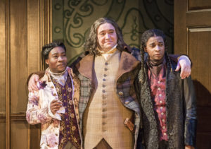 Fisayo Akinade (Witwoud), Christian Patterson (Sir Wilfull Witwould) and Simon Manyonda (Petulant) in The Way of the World. Photo Johan Persson