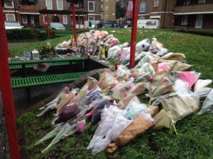FLOWERS continued to be laid at the Peckwater estate today (Monday) as young men and women paid tribute to Lewis Blackman, the 19-year-old killed in a stabbing yesterday.
