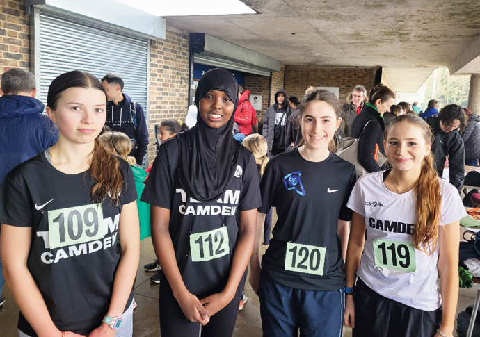Members of Team Camden’s Under-17s girls’ squad, from left, Josephine Luis, Faduma Abdi, Lizzie Wortsman, and race winner Leoni Delvendahl