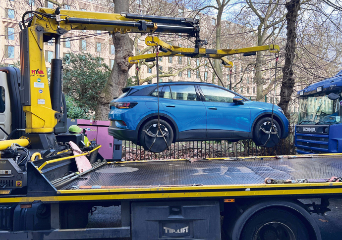 A car left in the street was said to be “broken into and hot-wired” before being moved out of the way of the film set.