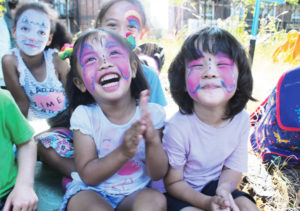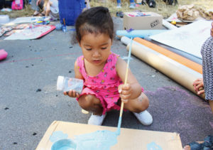 Smaia, 2, busily painting at the adventure playground