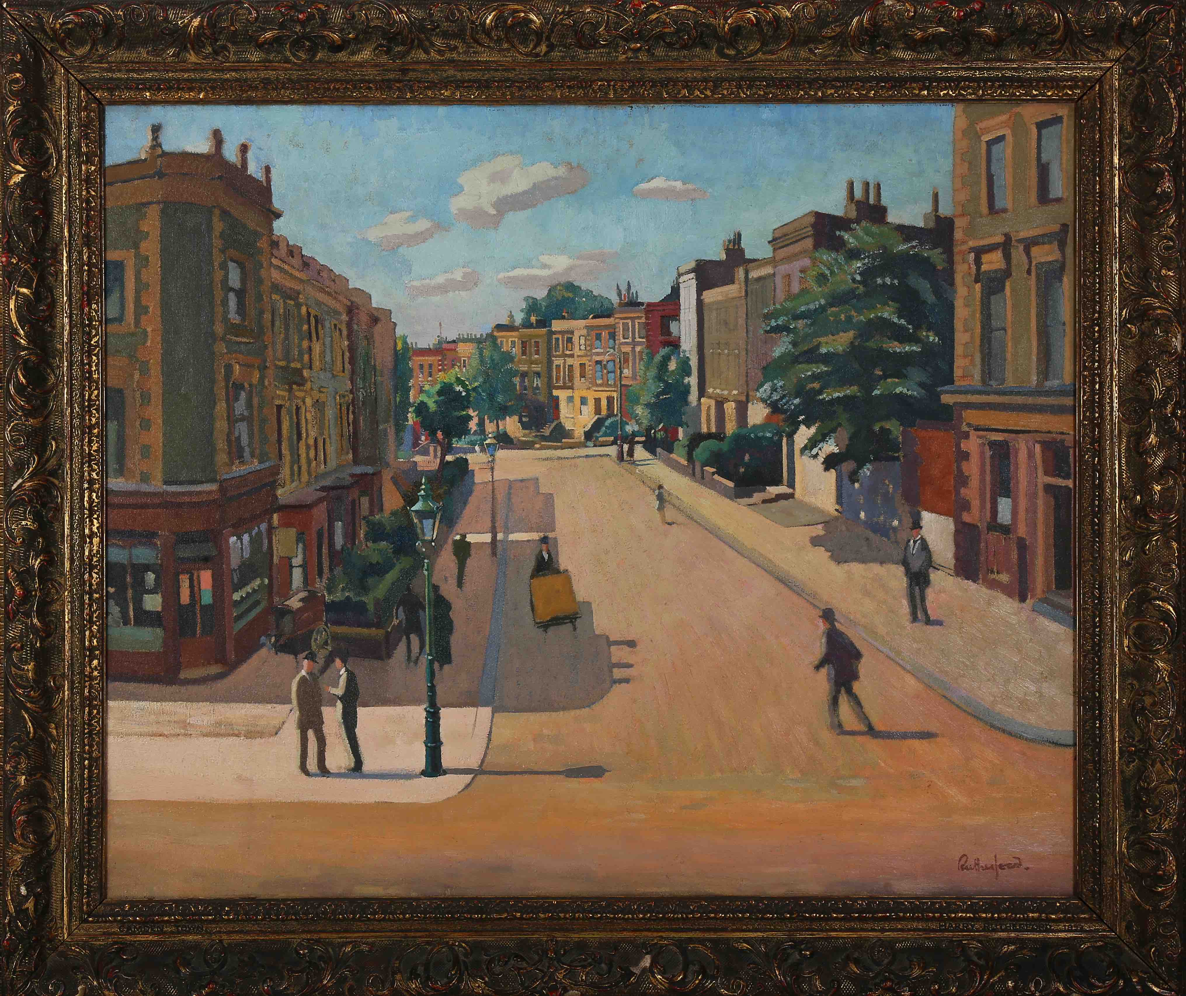 In the picture, the now closed Leighton Arms pub is clearly visible, while on the left is a corner shop – now homes. Rutherford was the protégé of Walter Sickert and worked at his studio in Highbury Place, Highbury Fields. Rutherford’s own studio was wrecked by a bomb during the Blitz, destroying many of his pre-war works.