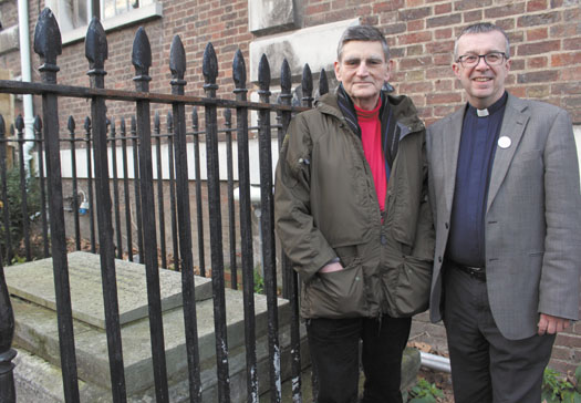 Trustee Michael Maunsell and Rev Simon Harvey beside the tomb of Richard Cloudesley