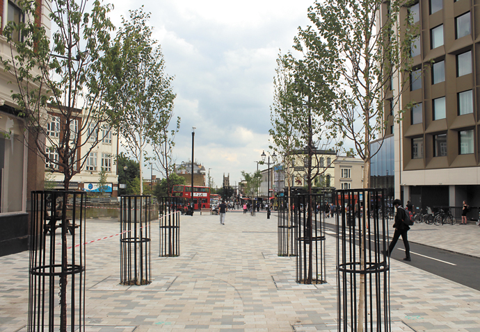 TOWN Hall and transport chiefs have in the past week celebrated the completed revamp of the new Archway Square. But one concerned resident has raised the alarm that the young trees, which in future years will shade the new plaza, are being severely neglected in the dry weather of recent weeks. Anita Frizzarin, 59, has taken it upon herself to water them, cycling up the hill with scores of bottles of water from her Upper Holloway home as part of a one woman sapling rescue mission. “About a third of the trees are in a bad way,” she says. “They’ve lost their leaves. Given the heat it can only be the water. One is practically dead. But I can only carry so much at a time. I never thought at my age I would be going round taking water to the trees. The young trees have very small roots, they don’t go a long way like the big trees. That’s why they need more water.” It turns out that Transport for London is responsible. A spokesman told the Tribune: “We appreciate the efforts of residents in caring for the trees and want to reassure them we’ve given our contractors an improved watering regime to follow to ensure the trees thrive…”