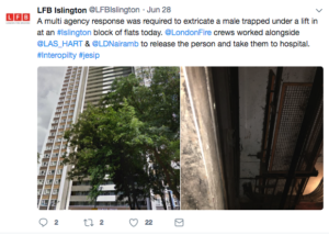 London Fire Brigade watch manager Steve Howlett, who was at the scene, said: “Firefighters manually lowered the lift and used specialist cutting equipment to cut through an adjacent lift to get the best access to reach him.