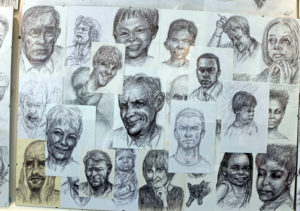 She is showing me how she captures the essence of a person’s face with just a humble biro (a Paper Mate®) and a small notebook.