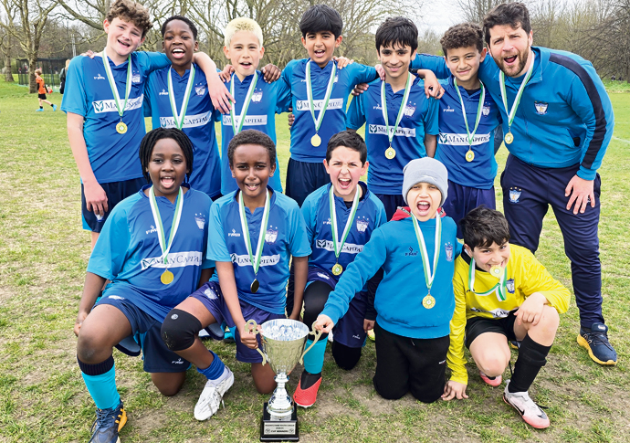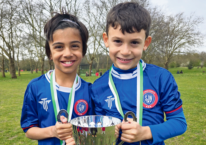 Goalscorers Joao Pedro and Sami Hirji, of St John’s Wood, lift the cup after their side (below) toppled Brent Cross 6-1 to win the Under-8s A Cup